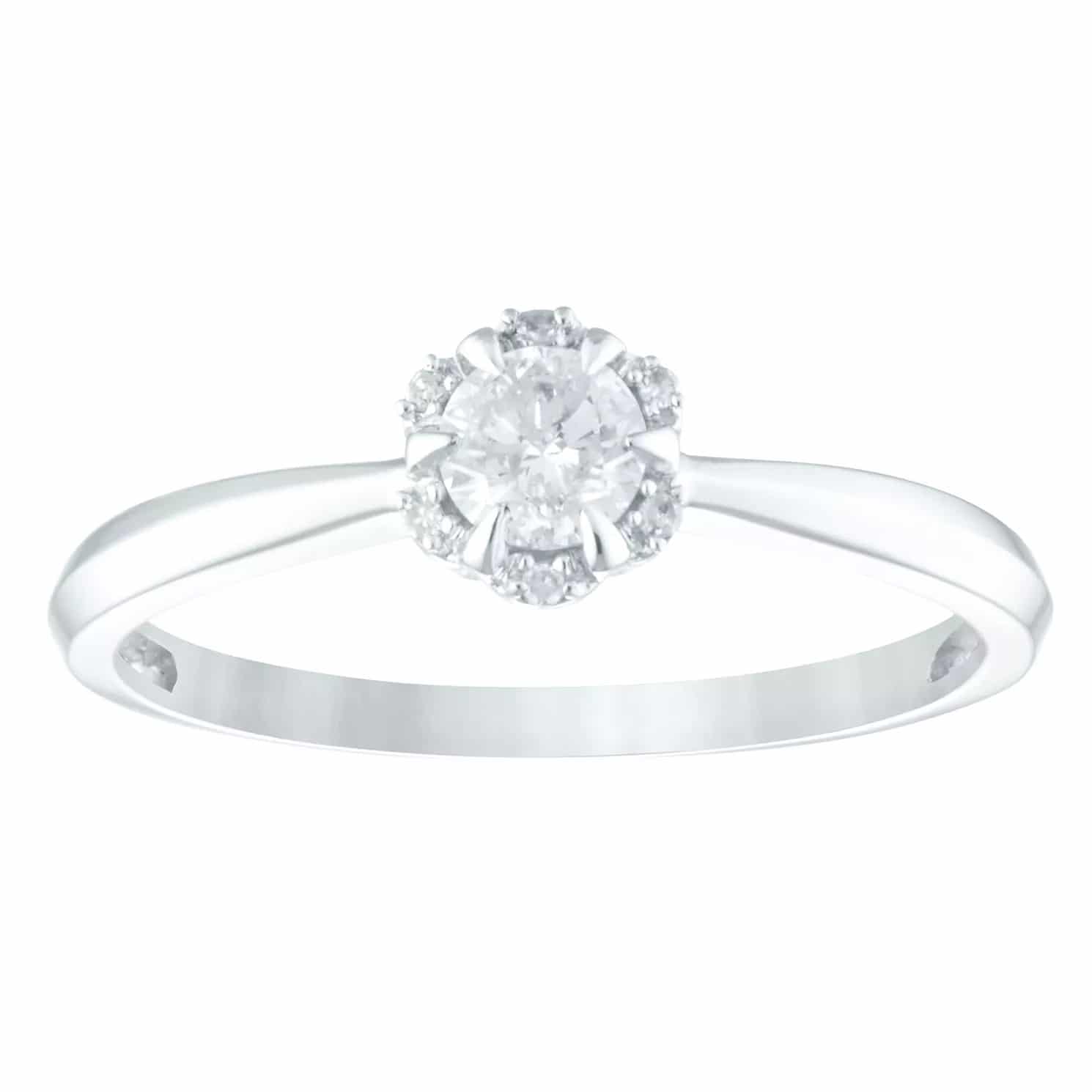 Offrez à celui que vous aimez des diamants exquis avec cette bague en or blanc 9 carats. Avec un diamant solitaire entouré de petits diamants taille ronde délicats d’un total de 1/4 carat au total, cette bague est le cadeau parfait pour afficher votre amour éternel. Cette bague est un ajout fabuleux à tout style d’empilage, ajoutant de la brillance et de l’éclat à n’importe quel look.