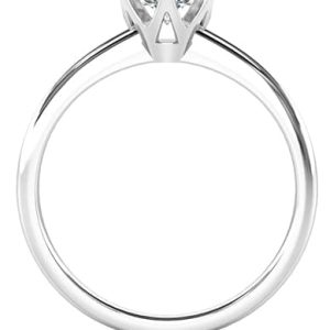 Un design magnifiquement conçu, composé d’un diamant rond taille brillant serti dans un sertissage à six broches, monté sur une bande en forme de cour.
